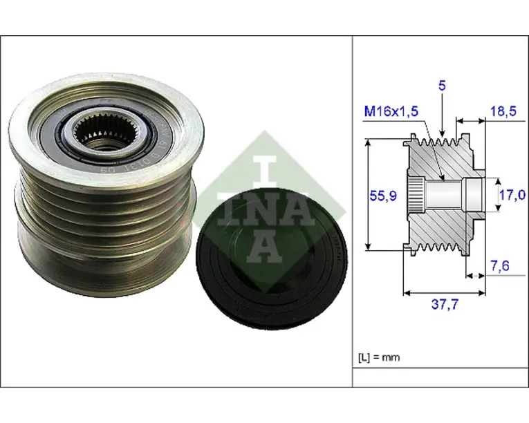 Fulie alternator OPEL SIGNUM, VECTRA C, VECTRA C GTS 2.0 2.2 intre 2003-2008 numar caneluri: 5.0 buc Latime: 37.7 mm Diametru interior: 17.0 mm Diametru exterior: 55.9 mm Greutate: 0.50kg numar caneluri: 5.0 pentru numar fabricant: F-552861.XX…