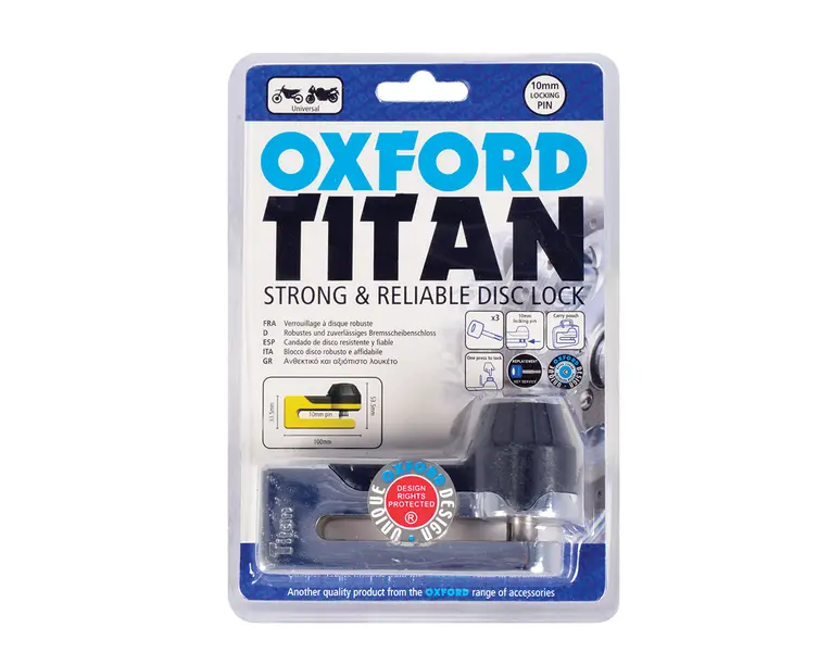 Blocaj Disc Frana Oxford Titan, Cromat, Saculet Depozitare, Bolt (10mm)blocare Disc, Dur Si De Incredere Fabricat Din Aliaj Dur Zamak Pinul De Blocare Din Otel De 10 Mm Mecanism De Blocare Oxford De Inalta Securitate Este Inclusa O Geanta De Transport