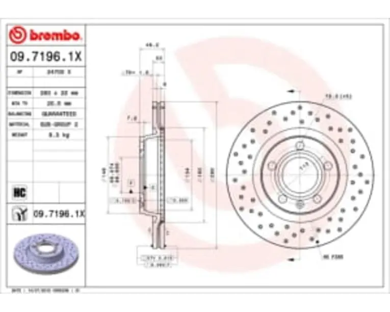 Detalii produs Pozitie de montare Fata Parte de fixare Dreapta / · Stanga Linie Xtra Diametru exterior 280.0 mm Grosime 22.0 mm Tip disc forate Tip disc ventilate Constructie disc o bucata Numar gauri de fixare 5.0 buc Diametrul gaurii 68.0 mm Cantitate 1.0 buc Inaltime 46.0 mm Distanta gauri 5x112 mm Grosime minima 20.5 mm Suprafata acoperit Unitate de vânzări 1 buc. Offer Tuning Greutate 6,56 kg Mărimea Pachetului 2 Cantitate recomandată 2 Cod Inter Cars E08455 Eticheta produs Eticheta printabila Index 09.7196.1X Nume Disc frana Producator BREMBO Unitate de masura piesa Importator Inter Cars Ro Tara de origine Italy Detalii TecDoc Tip disc frâna perforat/ventilat interior Grosime disc frâna [mm] 22.0 Numar gauri 5.0 Înaltime [mm] 46.0 Diametru de centrare [mm] 68.0 Diametru exterior [mm] 280.0 Procesare continut ridicat de carbon Suprafata acoperit (cu un strat protector) Grosime minima [mm] 20.5 Moment strangere [Nm] 120.0 ECHIVALENTE APLICATII