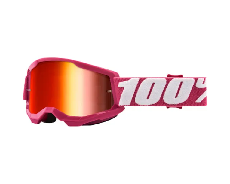Ochelari Cross/atv 100% Strata 2 Copii, Lentila Oglinda, Culoare Rama Roz Ochelari Pentru Copii Cross/atv Curbura Speciala Pentru Forma Fetei Copiilor. Burete In Doua Straturi Pentru Confort Optim Si Absorbtia Transpiratiei. Rama Din Uretan Flexibil Si Rezistent Cu Finisaje Mate Si Lucioase. Lentila Din Lexan Tratata Anti-aburire, Rezistenta La Zgarieturi, Pentru Un Camp Vizual Fara Egal. Banda Elastica De 40mm Cu Silicon Imprimat Pentru A Tine Ochelarii Pe Pozitie In Orice Conditii.